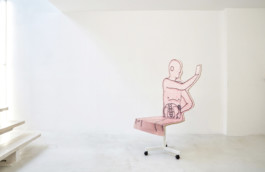 As humans, arrested in our three dimensions (plus time, time the elusive), we may all be as in the tale of the blind men describing an elephant through just one sense. It could that art is this attempt: to reach the unperceived realities of string theory through our lacking senses. But even in our industrial design, objects try to shape themselves to serve our bodies, as I seem to infer from David Schiesser's collection of chairs in which his practices attempt to morph into one: the drawing, the tattooing, the skin and the canvas. Our relationship to the world of lines and planes is here, in a body that calculates the heights, lengths and widths so as to climb a staircase safely. The folding of lines and planes of a body that sits down. And if we have brought evolution into this, it is clear why the various species of flatfish seem to obsess Mr. Schiesser. The flatfish that has cheated the cage of three dimensions for safety and survival.